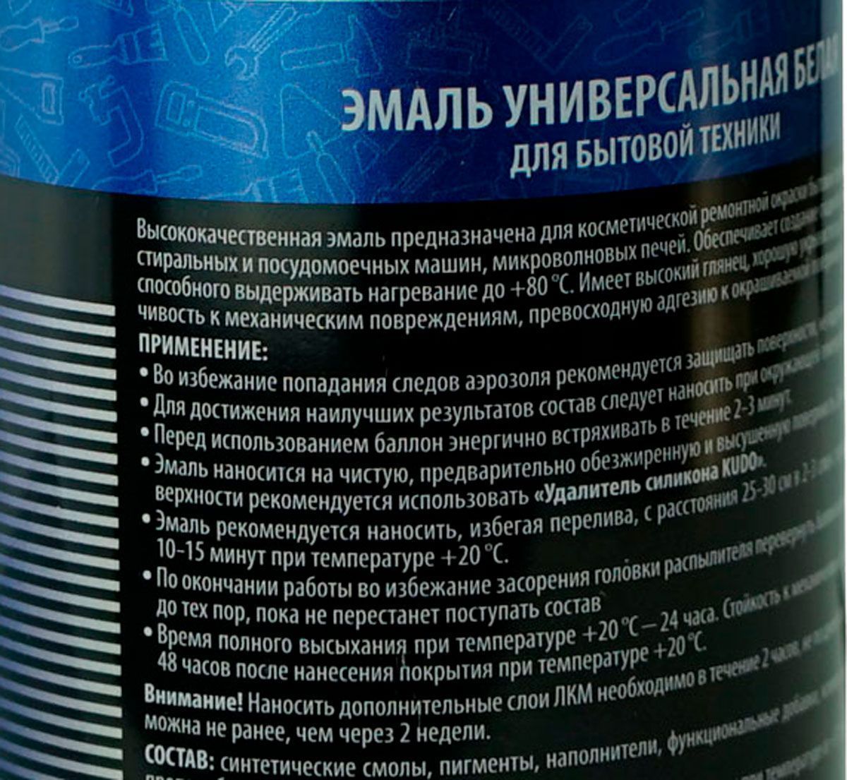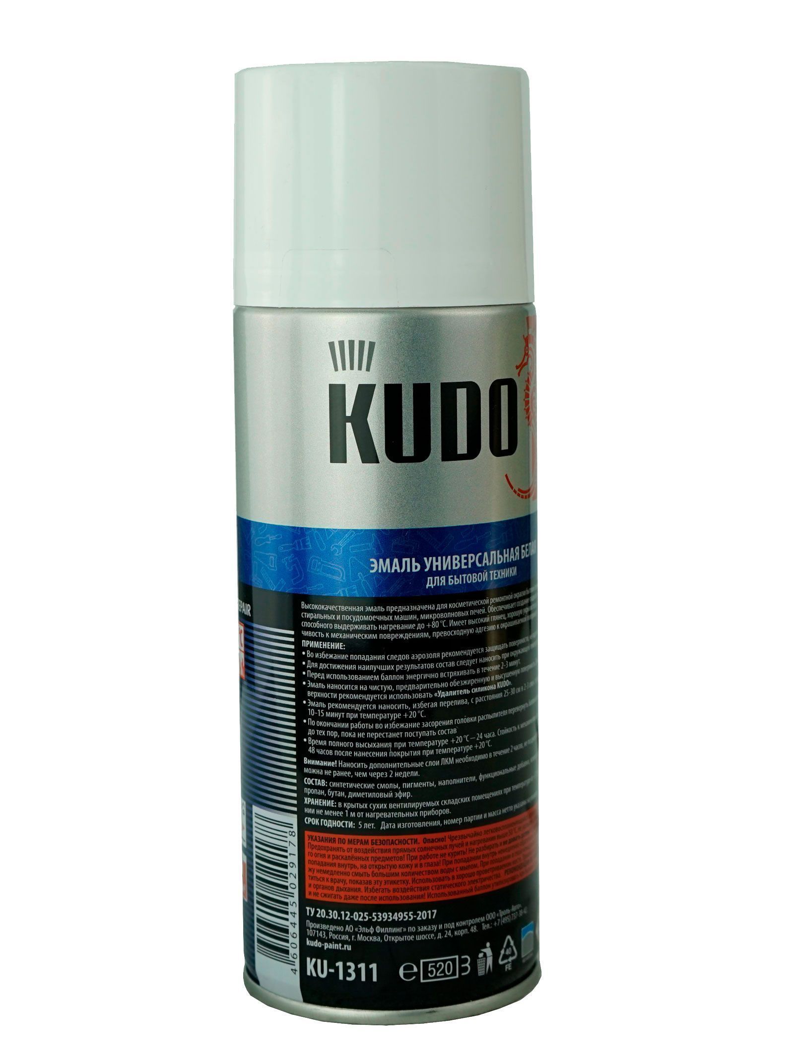 Высококачественная эмаль KUDO® KU-1311 предназначена для косметической ремонтной окраски бытовой техники: холодильников, стиральных и посудомоечных машин, микроволновых печей. Обеспечивает создание гладкого и прочного покрытия, способного выдерживать нагревание до +80°С.
