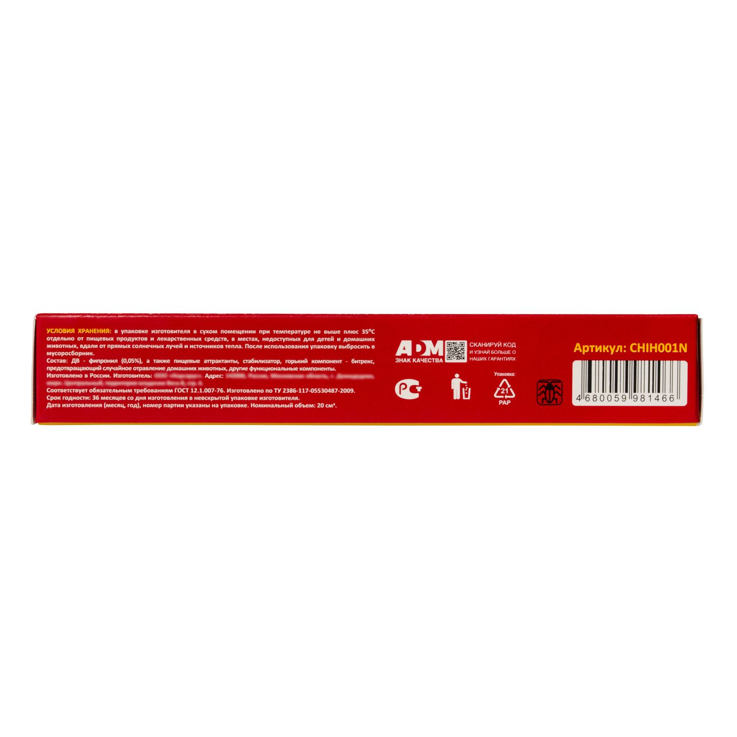 В состав инсектицидного средства входят фипронил (0,05%), пищевые аттрактанты, стабилизатор, битрекс, другие функциональные компоненты. Действующее вещество – фипронил обладает контактным и кишечным действием на насекомых. Он блокирует гамма-аминомасляную кислоту (ГАМК), регулирующую прохождение нервного импульса через хлорионные каналы в мембранах нервных клеток, чем нарушаются функции нервной системы: насекомое погибает от сильного нервного перевозбуждения. Использование специализированного ароматизатора в составе способствует усиленному привлечению внимания тараканов и муравьев и эффективной работе геля.