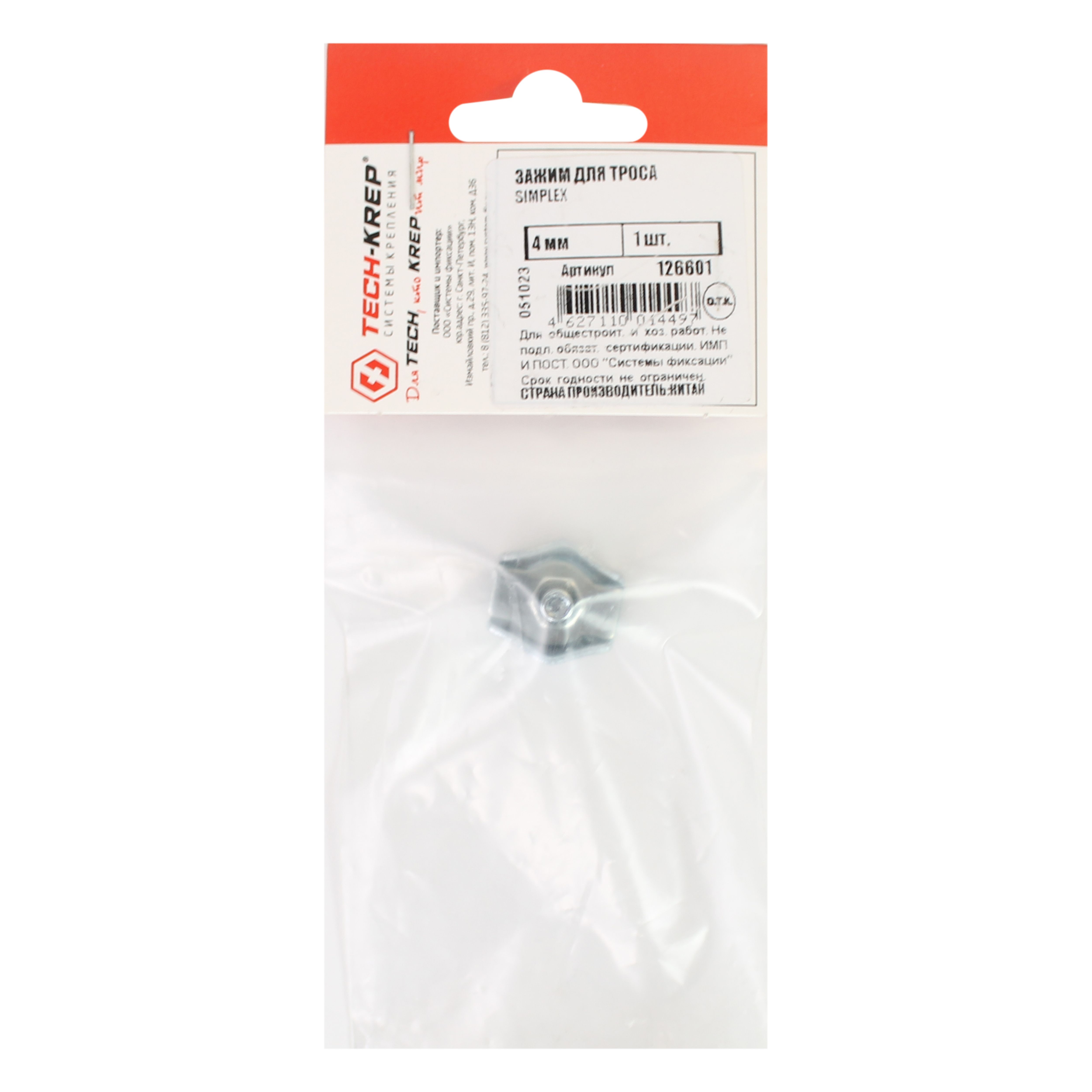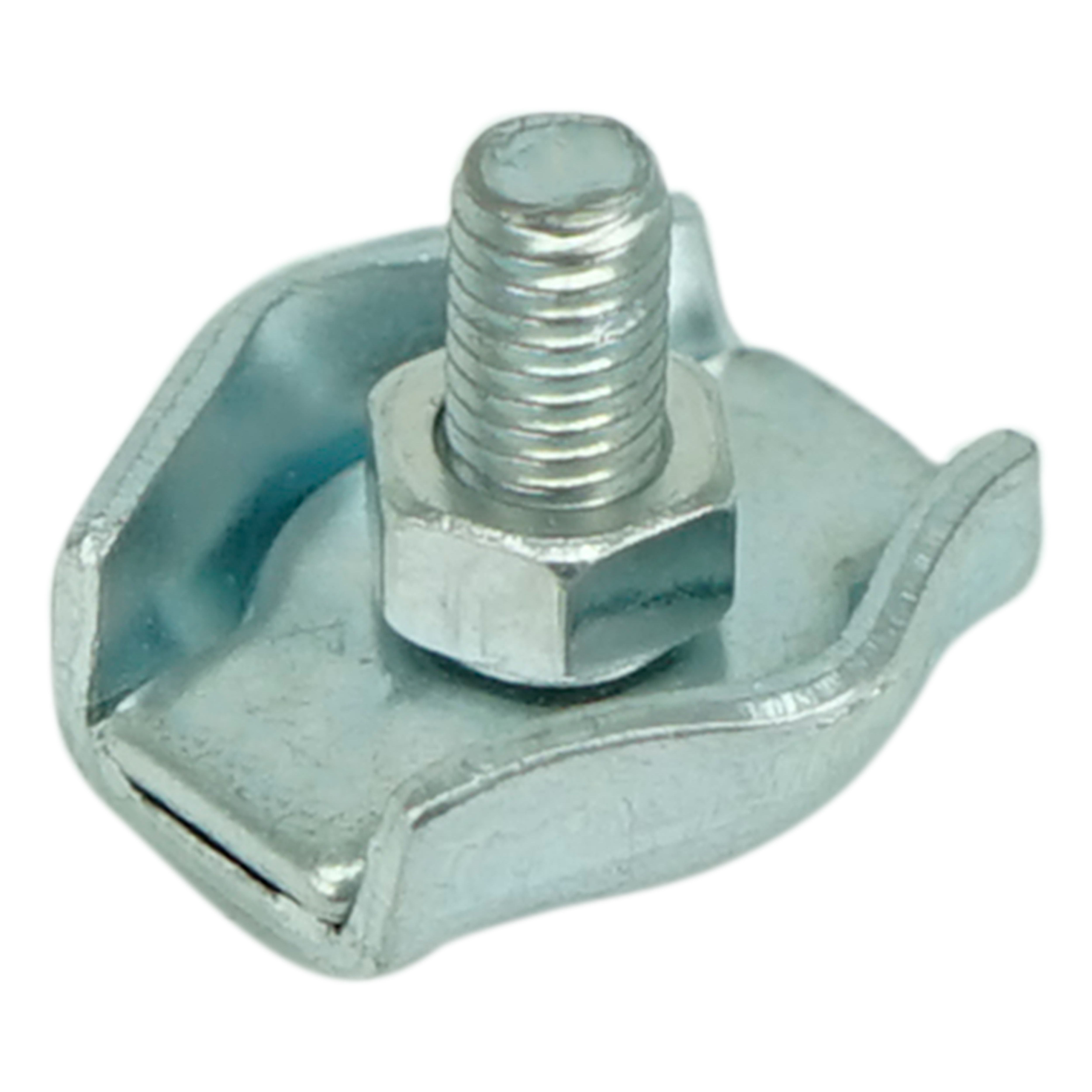 Зажим для троса одинарный C-SWR (Simplex) состоит из следующих элементов: пластина с изогнутыми краями, которая служит основанием, приваренный к пластине-основанию винт с метрической резьбой, прижимная пластина и шестигранная гайка. Зажим изготовлен из углеродистой стали с антикоррозионным цинковым покрытием.