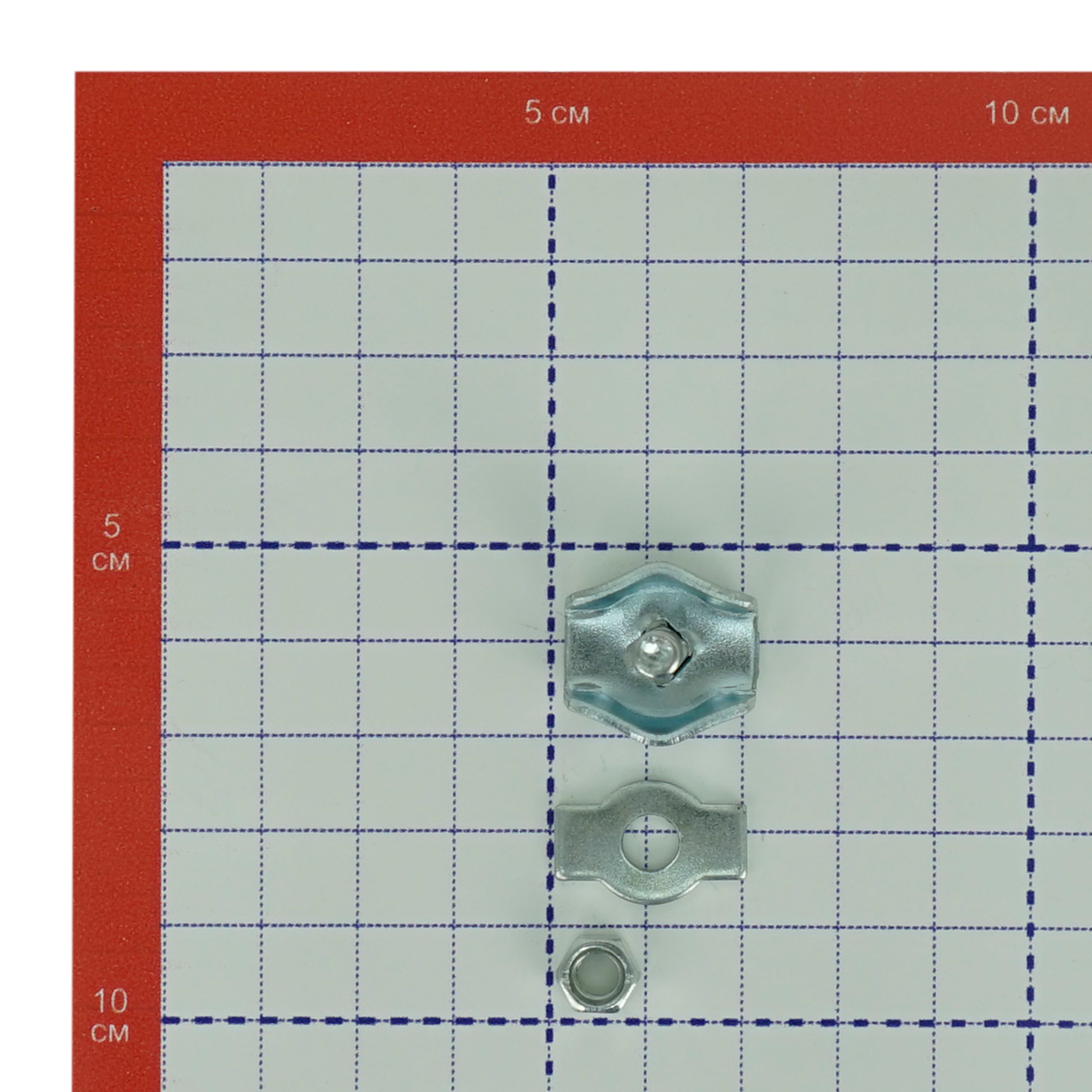 При установке зажима стальной трос или канат размещается на пластине-основании по обоим краям, затем прижимается второй пластиной и затягивается гайкой. Рекомендуется устанавливать не менее двух зажимов на один узел сращивания или одну петлю.