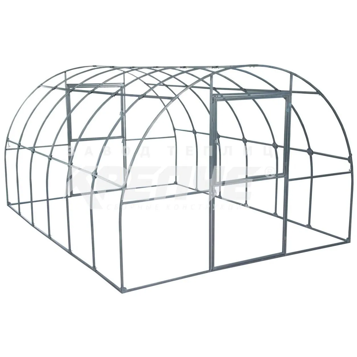 Каркас сделан из оцинкованной квадратной трубы сечением 20х20, расстояние между дугами 65 сантиметров, дуги скреплены 7 продольными перемычками. Ширина каркаса 3 метра, высота 2,1 метра, длина 4 метра. Дуги и перемычки скреплены между собой краб-системой. Каркас имеет две двери шириной 1 метр (с каждой из сторон), на каждой двери имеется форточка для проветривания. Двери и форточки снабжены удобными ручками для открывания, а также крючками для фиксирования. Данная модель имеет снеговую нагрузку до 150 кг на м2, установки подпорок в зиму не требует. Теплица крепится к грунту анкерами длиной 1 метр.