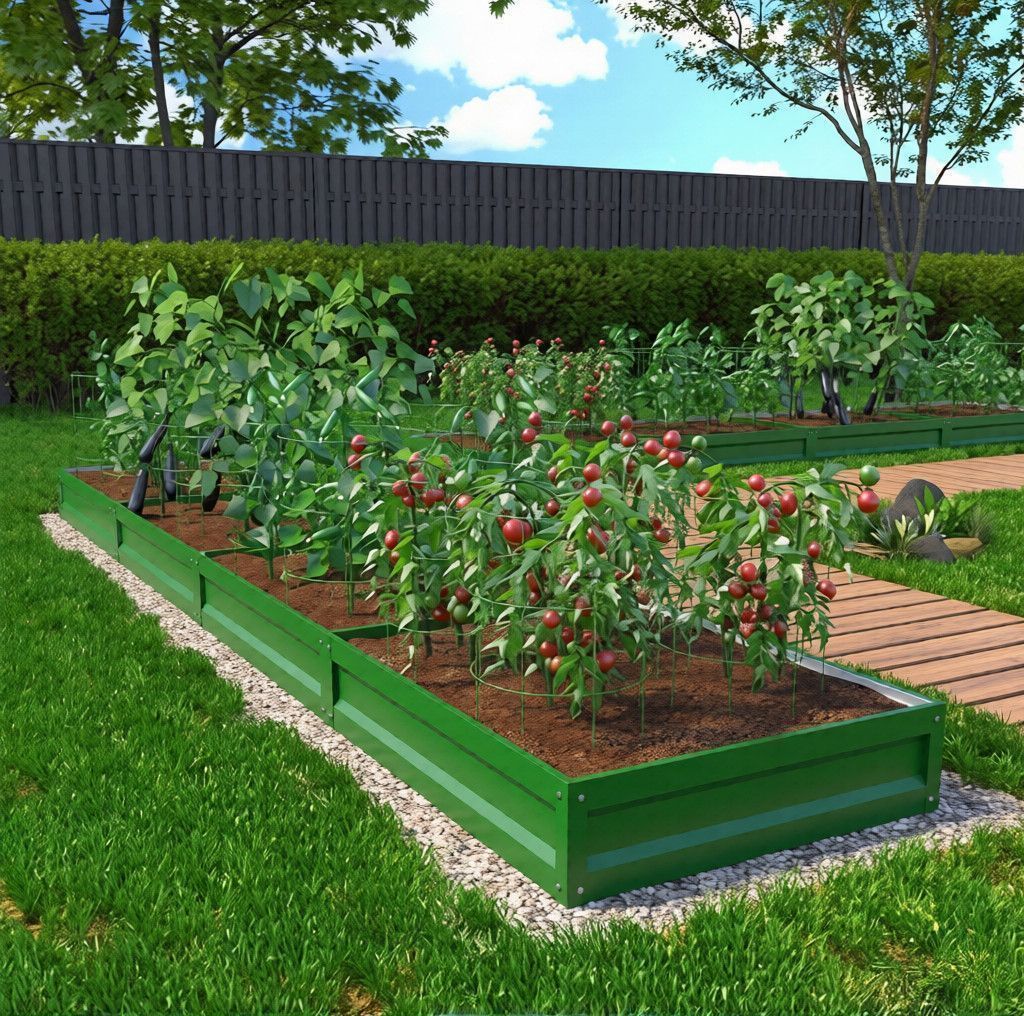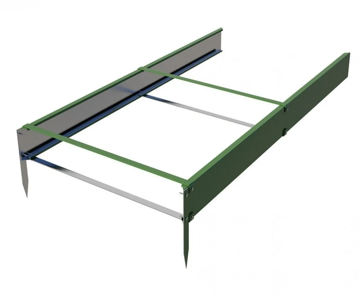 Грядки изготовлены из оцинкованного металла толщиной 0,4-0,45 мм, каждая фигурная панель имеет по 8 ребер жесткости, все острые края завальцованы.