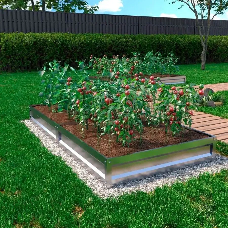 Грядки изготовлены из оцинкованного металла толщиной 0,4-0,45 мм, каждая фигурная панель имеет по 8 ребер жесткости, все острые края завальцованы.