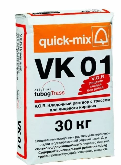 Цветной кладочный раствор quick-mix VK 01 с трассом для выполнения кирпичной кладки и одновременной отделки швов (в одном рабочем цикле) при использовании сильно водопоглощающего лицевого кирпича с водопоглощением ~ 8-10%. Кладка устойчива к погодным условиям, в т.ч. к прямому дождю, риск образования высолов на поверхности швов кладки минимален.
