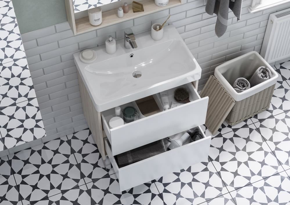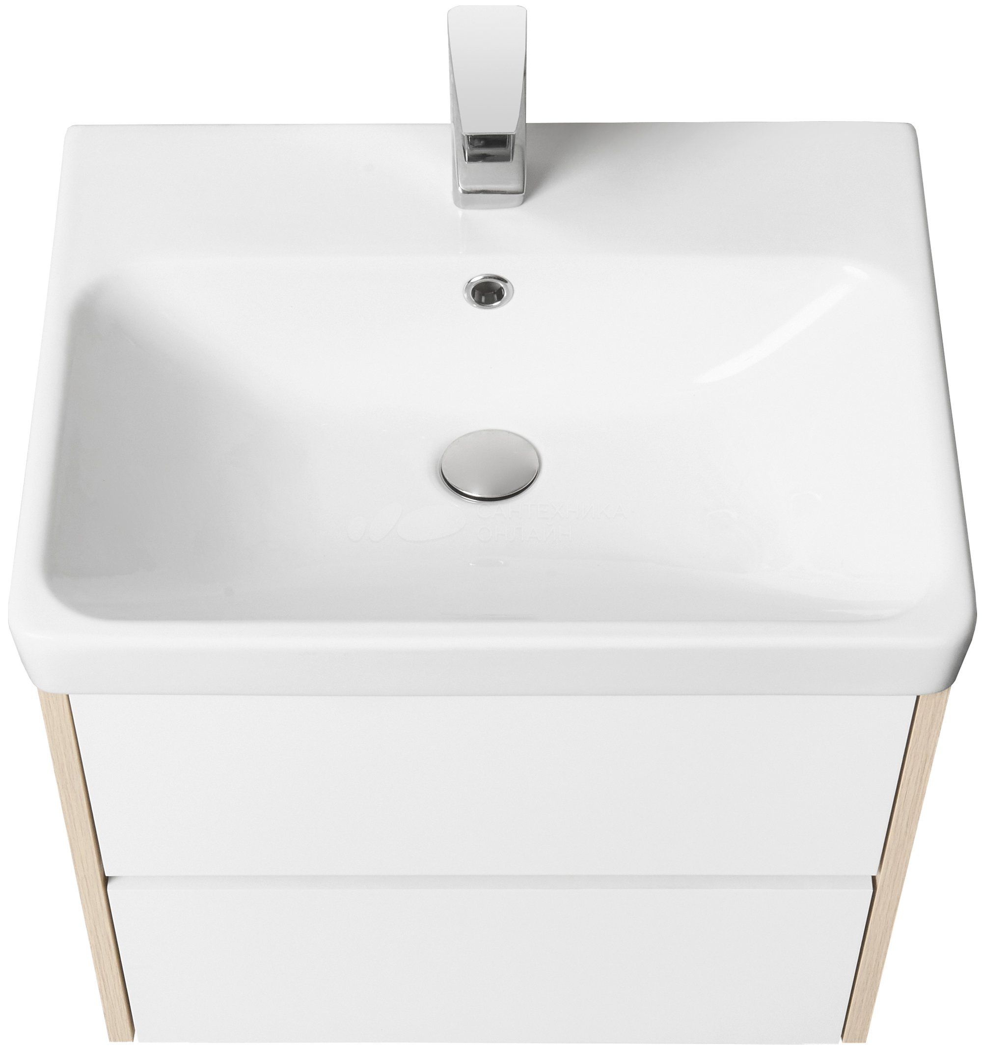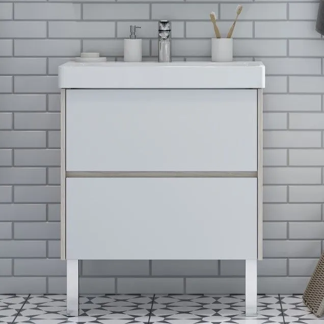 Тумба Сканди 70 выполнена в популярном минималистичном скандинавском стиле. Корпус тумбы выполнен из влагостойкой ЛДСП в декоре натурального дерева, а фасады в белой глянцевой покраске. Конструктивно тумба состоит из 2 вместительных ящиков, установленных на направляющие с интегрированной системой push-to-open для комфортного использования. На тумбе нет выступающих деталей и фурнитуры, открытие ящиков реализовано нажатием на фасад. Тумба комплектуется белоснежной раковиной Адриана от бренда Santek. Тумбу по желанию можно использовать в двух вариантах: как подвесную или дополнительно приобрести опоры.