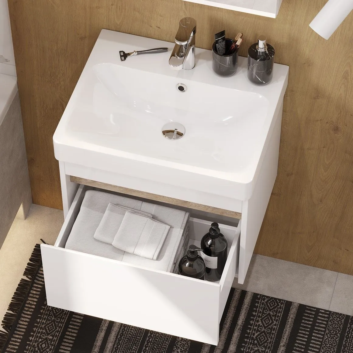 Тумба МАРТИ 55 отличается вместительностью и удобством в использовании: при желании в ящике можно организовать хранение не только шампуней и кремов, но и, например, полотенец. При этом тумба МАРТИ смотрится интересно благодаря выпилу на фасаде, который позволяет открывать тумбу за фасад: в углублении видна контрастная вставка в древесной отделке. Эта акцентная деталь придает модели графичность и позволяет подчеркнуть правильные пропорции тумбы. Декоративная вставка в цвете дуб эндгрейн. Тумба комплектуется белоснежной раковиной Адриана от бренда Santek.