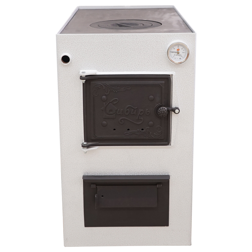 Котел Сибирь отлично подойдет для дома и дачи. Данный котел функционирует на твердом топливе: дрова, прессованные брикеты, уголь. Имеется варочная поверхность. В конструкции предусмотрена возможность установки автоматического регулятора тяги подачи воздуха и блока ТЭН. Подключение в систему отопления универсальное, выход дымохода сзади.