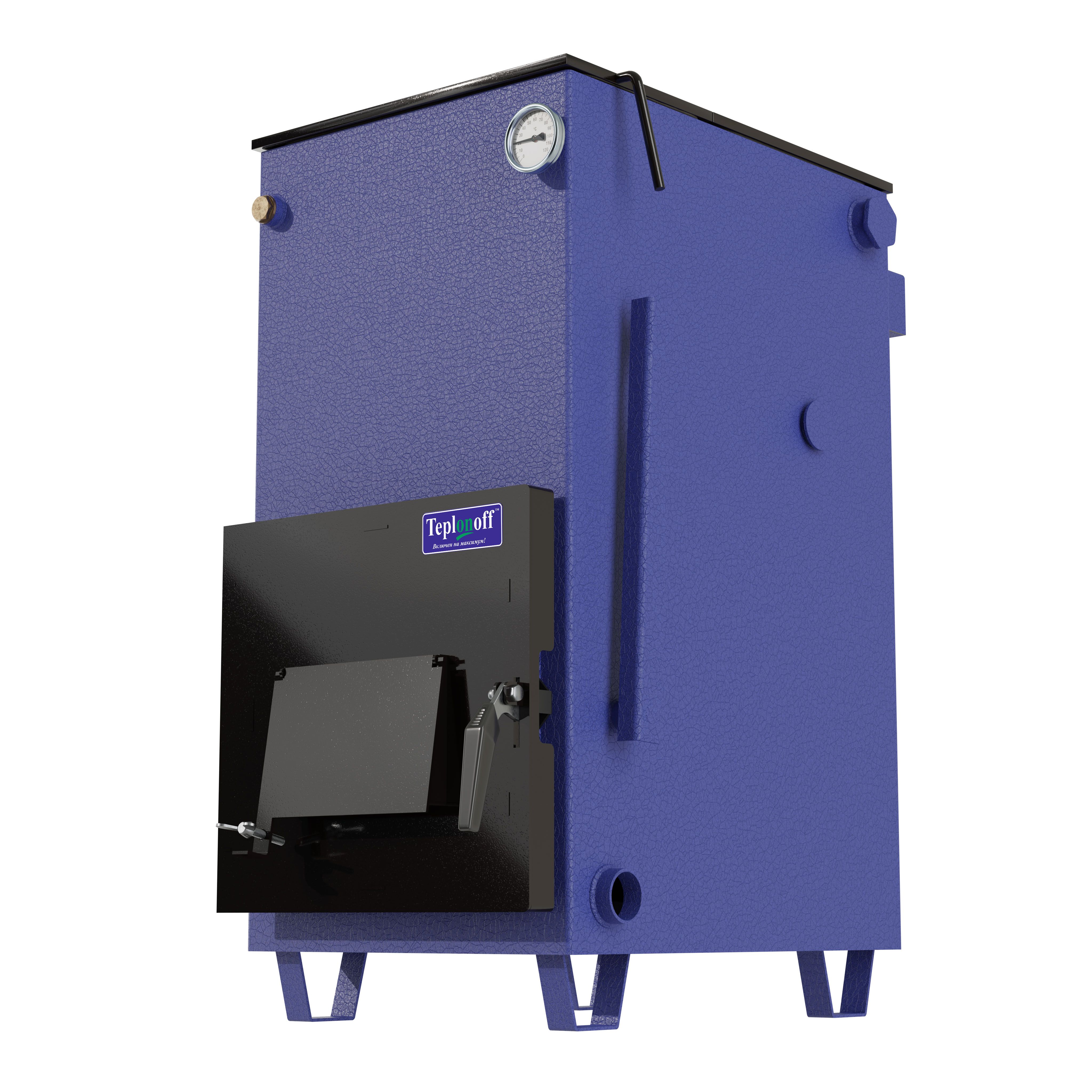 Котел Теплонофф серии ULTRA – это котел длительного горения, что достигается за счет послойного сжигания топлива и наличия камеры дожига дымовых газов. Данный котел функционирует на твердом топливе: дрова, прессованные брикеты, уголь. В конструкции предусмотрена возможность установки автоматического регулятора тяги подачи воздуха, блока ТЭН мощностью 3-6 кВт, командо-контроллера, управляющего работой насоса и турбины, турбины и бункера. Подключение в систему отопления универсальное, выход дымохода сзади.