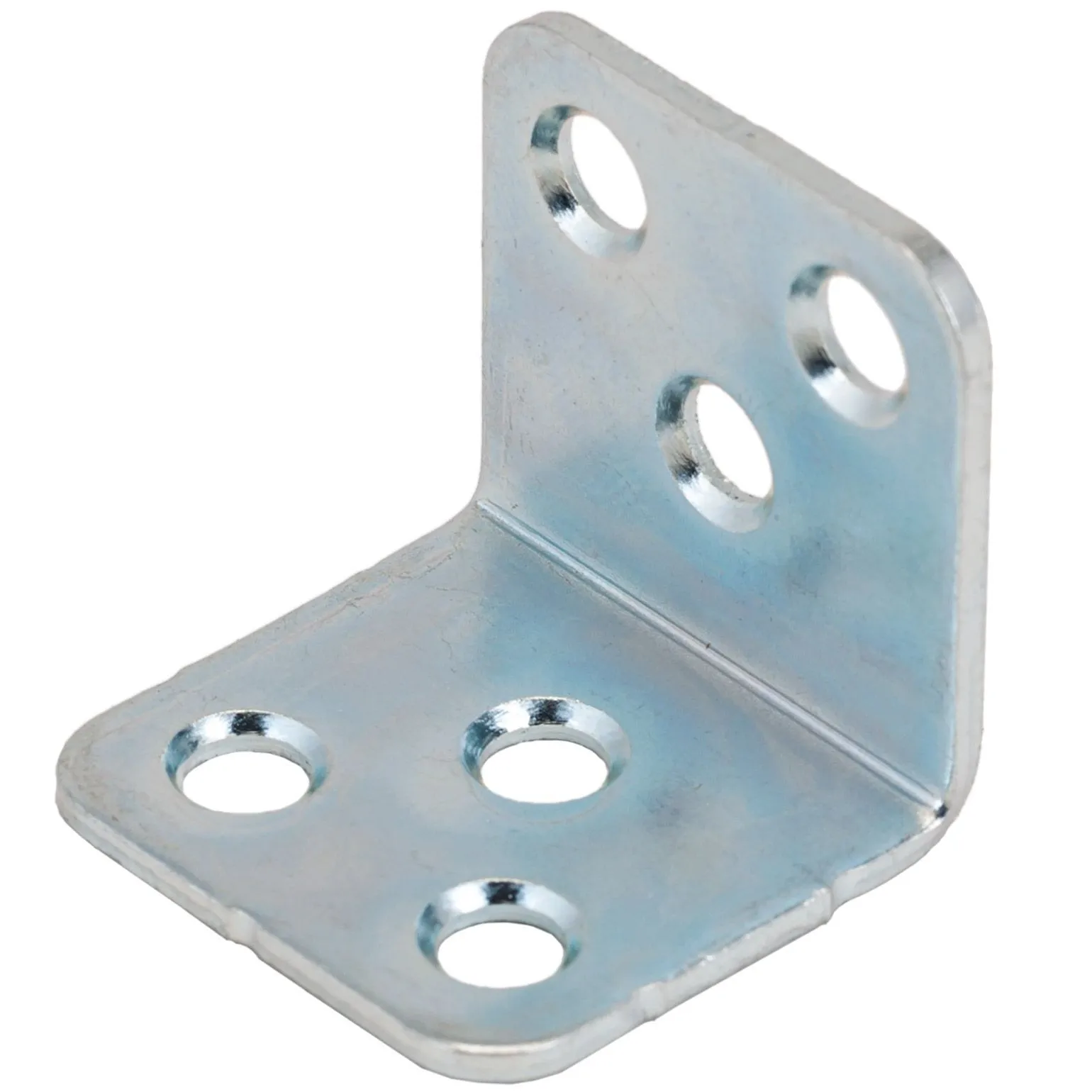 Уголок мебельный изготовлен из стали. Представляет собой пластину, согнутую под прямым углом. По центру проходит ребро жесткости. На обоих плечах (сторонах уголка) есть отверстия круглой формы для крепежа.