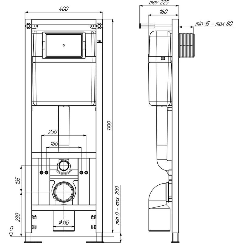 - Размеры инсталляции (В х Ш х Г) мм. - 1100–1300 (регулируемая) х 400 х 160-225 (регулируемая);
