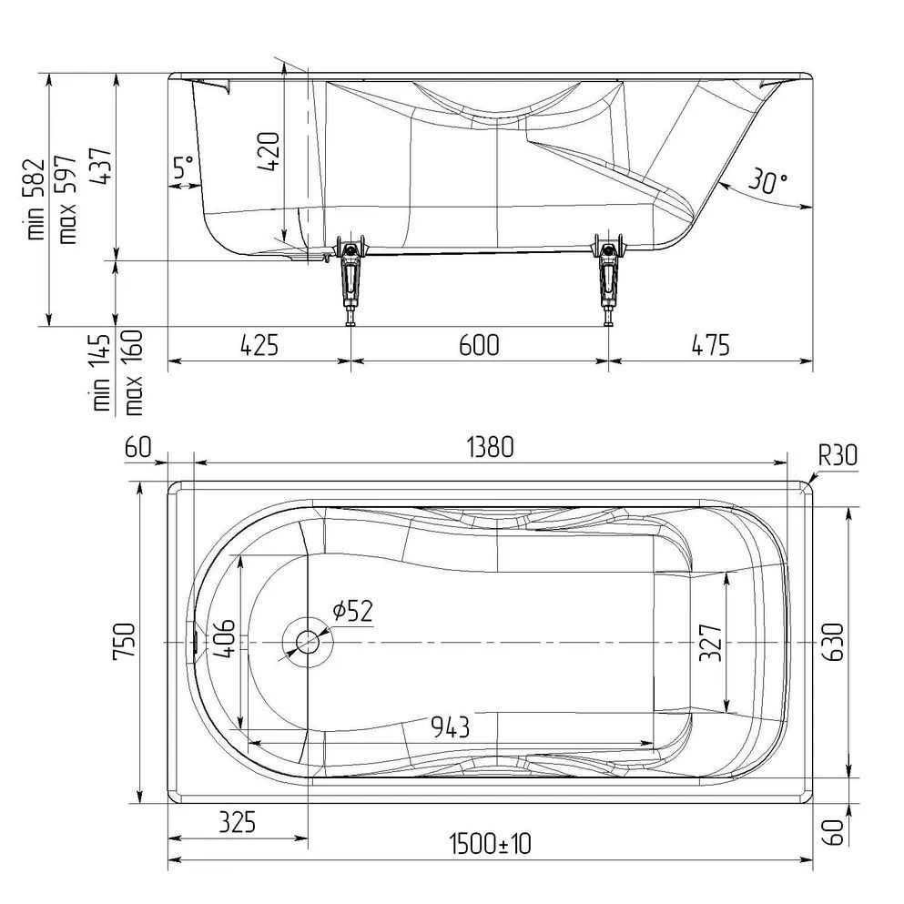 Ванна устанавливается строго горизонтально (по уровню), слив воды обеспечивается уклоном дна в 1,5 градуса.
