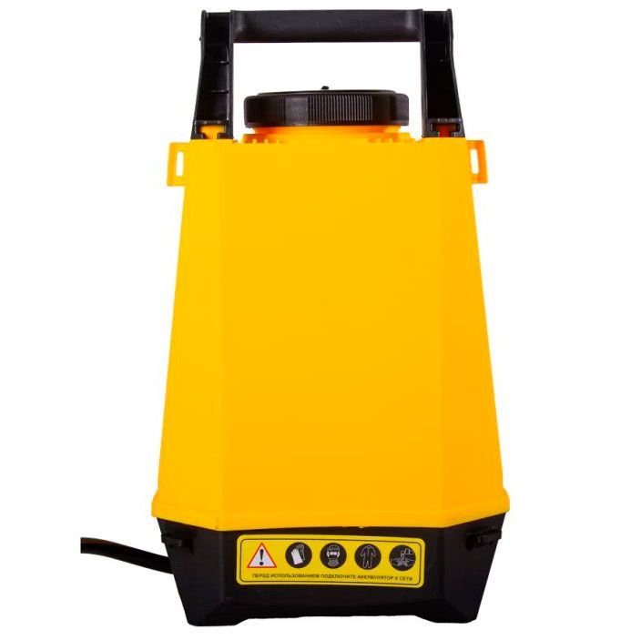 Опрыскиватель оснащен производительной помпой и свинцово-кислотным аккумулятором мощностью 12 В и емкостью 2 Ач, который обеспечивает длительную автономную работу без необходимости постоянной подзарядки.