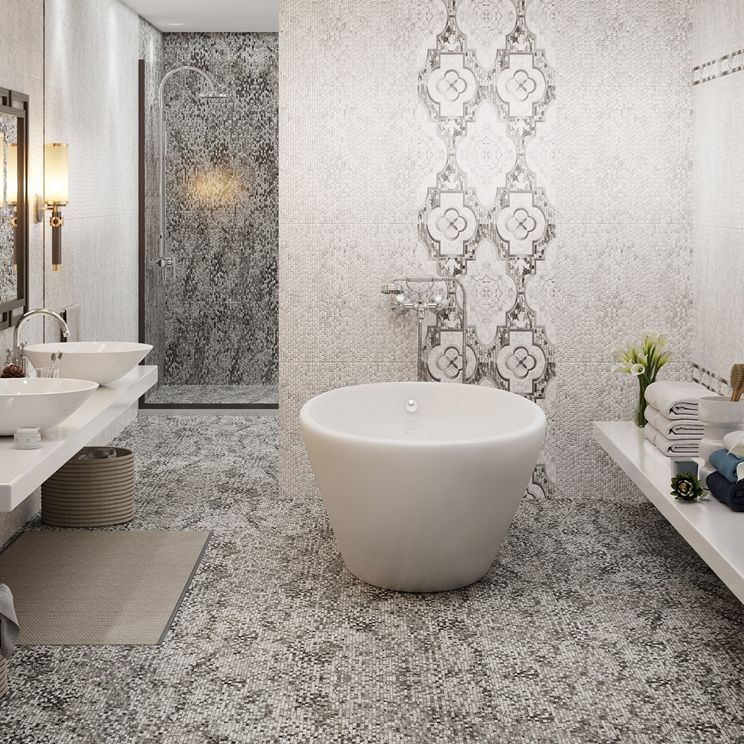 Коллекция Венеция Axima представляет потрясающее дизайнерское решение: традиционные итальянские орнаменты органично обыграны в манере оп-арт, возникшей в 50-е годы прошлого века. Активная геометрия является сильным акцентом в современном модном интерьере. Элементы коллекции — это светлые серо-бежевые плитки, состоящие из множества рельефных прямоугольников. Исходя из индивидуальных предпочтений дополнить дизайн можно плитками с более тёмным серым цветом, либо с более насыщенным бежевым. Для совмещения зон разных оттенков существует плитка с каскадным переходом.