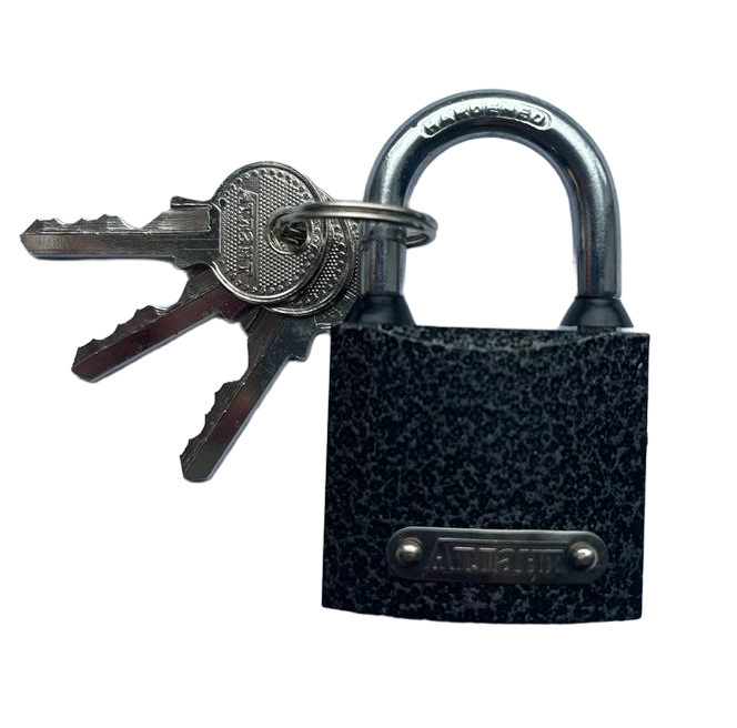 Замок навесной Атлант со стальной дужкой. Высота 60 мм, ширина 38 мм.